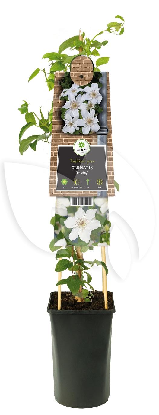 De Clematis staat bekend als een prachtige klimplant voor in de tuin. De Clematis Destiny is voorzien van sfeervolle witte bloemen die uitbloeien in de zomer. Door de plant aan te planten in het voorjaar op een zonnige plek zal deze tot het mooiste resultaat komen. Geniet van jouw mooie tuin die er sfeervol bij staat met de Clematis.